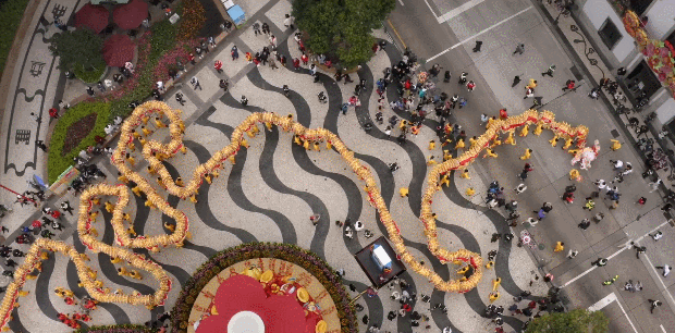 新春来临之时,人们以舞龙的方式庆祝新年,澳门城里的路很窄,要想舞得尽兴,龙就必须特别长。一条窄巷,龙跑,人也跑,龙一直在舞,人一直在追,穿过一条条街巷,处处都是热闹。