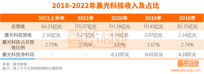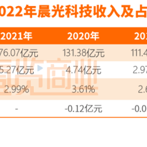 但据财报显示,最近5年间晨光科技营收占比始终不足5%,虽然在2019年和2020年,占比略有提升,但2021年和2022年又迅速下降。2022上半年晨光科技营收占比与2018年相比甚至还减少了0.01个百分点。