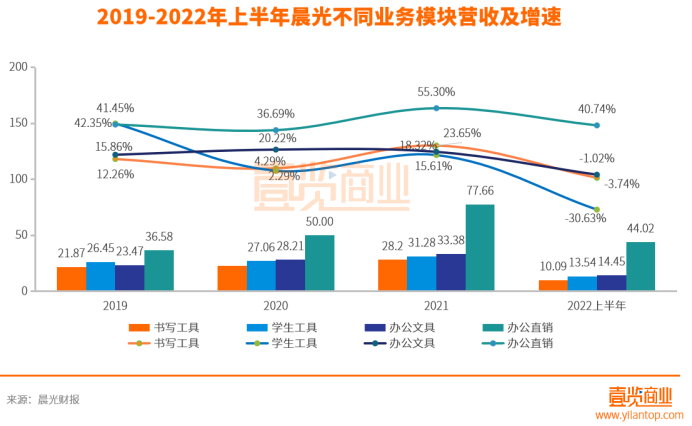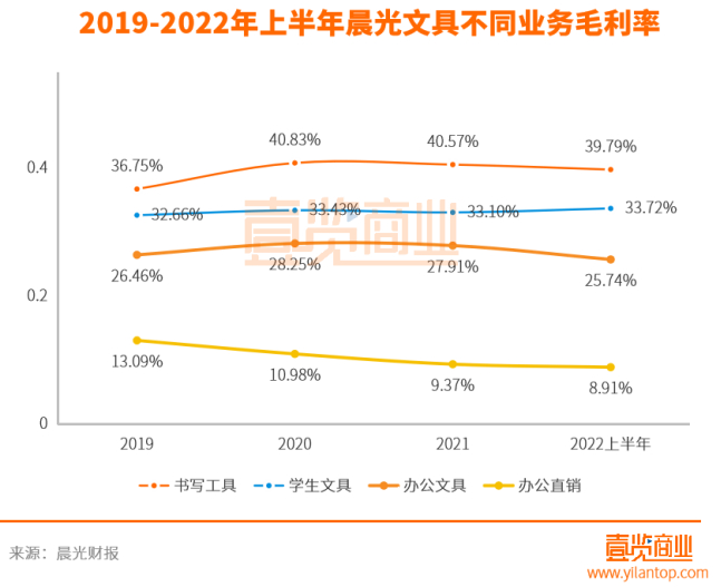 2019年办公直销部分营收36.58亿元,增速41.45%,随后几年一直保持在35%以上的高速增长。但书写工具、学生工具和办公文具的营收增速在2019年之后就全部低于办公直销,还在2022上半年出现了负增长,其中学生工具营收减少-30.63%,而同时办公直销的营收增速是40.74%。