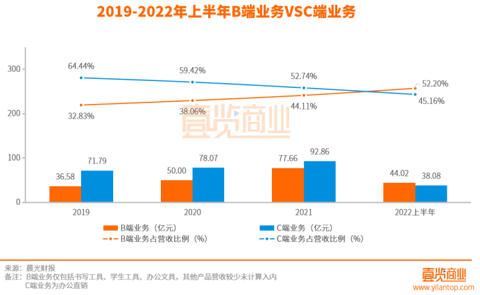 从营收增速来看,B端办公直销业务一直保持高速增长,C端业务的书写工具、学生工具和办公文具增速乏力,甚至出现负增长。