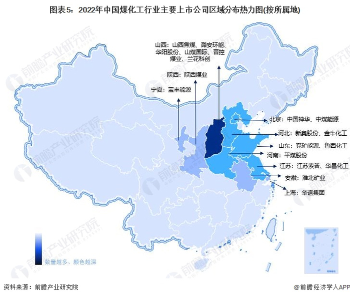 从我国煤化工行业主要上市公司区域分布热力图来看,我国煤化工行业上市公司较为集中的分布在山西省,区域内上市公司数量较多且公司规模较大,拥有如山西焦煤、华阳股份和山煤国际等煤炭行业龙头企业;除此之外,北京、河北、山东和江苏等省市也有较多煤化工行业竞争者分布,如中国神华、中煤能源、新奥股份、兖矿能源和华昌化工等。2022年我国煤化工行业主要上市公司区域分布如下: