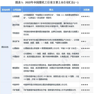 煤化工按加工深度不同,可分为产业链上游的基础煤化工和中下游的精细煤化工;按发展成熟度不同,可分为传统煤化工和现代煤化工。传统煤化工主要包括煤制化肥、合成氨和焦炭,现代煤化工主要是新型煤基能源和新型煤基材料,中游煤化工企业主要包括中国神华、中煤能源和陕西煤业等。煤化工下游应用较为广泛,其产品多为工业领域的原材料,涉及燃料、医药业、农业、制造重轻工等各个领域。截至2022年10月我国煤化工行业主要上市公司汇总如下: