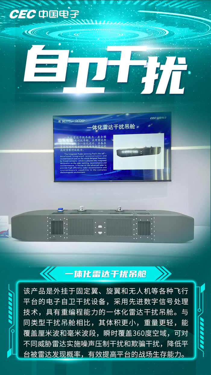 一体化雷达干扰吊舱是外挂于固定翼、旋翼和无人机等各种飞行平台的电子自卫干扰设备,采用先进数字信号处理技术,具有重编程能力。与同类型干扰吊舱相比,其体积更小,重量更轻,能覆盖厘米波和毫米波段,瞬时覆盖360度空域,可对不同威胁雷达实施噪声压制干扰和欺骗干扰,降低平台被雷达发现概率,有效提高平台的战场生存能力。
