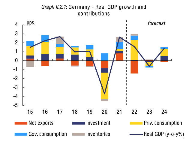 东正期货资深外汇分析师元涛在接受第一财经记者采访时表示,之所以欧委会对德国经济持悲观态度,是因为德国经济受俄乌冲突、全球经济下行压力影响较大。“目前,德俄在能源问题上仍持续胶着。失去俄罗斯能源供应,将使欧洲能源价格长期保持高位。此外,德国也不会在一夜之间摆脱对能源进口的依赖。”他说,“不仅如此,德国还是典型的外向型经济,在全球经济增速趋缓背景下,德国对外出口或受一定负面冲击。”