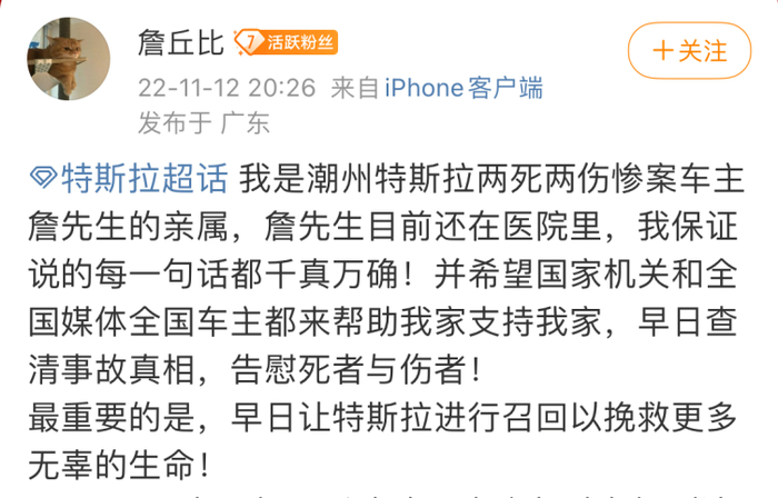 根据媒体报道,家属还称,事故发生后特斯拉厂家曾派两名工作人员到现场调查,目前尚未给出确定说法。涉事车主今年55岁,以前是货车司机,有20多年的货车驾驶经历,身体健康,驾驶的是一辆特斯拉MODEL Y车型,是2022年11月初从朋友处转让过来的新车。目前车主仍在医院接受治疗,肋骨断了几根,脑震荡,暂时没有生命危险。