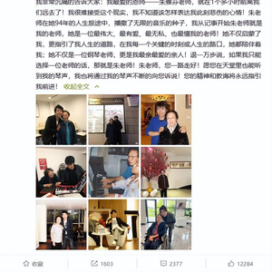 “我非常沉痛地告诉大家:我最爱的恩师——朱雅芬老师,就在1个多小时前离我们远去了!我很难接受这个现实,我不知道该怎样表达我此刻悲伤的心情!朱老师在她94年的人生旅途中,播撒了无限的音乐的种子,我从记事开始朱老师就是我的老师,她是一位最伟大、最有爱、最无私、也最懂我的老师!她不仅启蒙了我,更指引了我人生的道路,在我每一个关键的时刻或人生的路口,她都陪伴着我;她不仅是一位钢琴老师,更是我最亲最爱的亲人!退一万步说,如果我只能选择一位老师的话,那就是朱老师!朱老师,您一路走好!愿您在天堂里也能听到我的琴声,我也将通过我的琴声不断的向您诉说!您的精神和教诲将永远指引我前进!”
