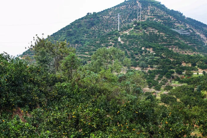 桔园山坡地呈梯田式分布,梯面宽度在3~4米,桔树均可受到充足的阳光、雨露滋养。