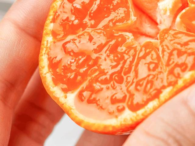 果肉软嫩无渣,像一颗甜水小炮弹,从薄薄的瓣膜里炸裂开来,倾泻而出,甜而不腻,满嘴爆汁的满足感,不愧叫“涌泉”蜜桔。