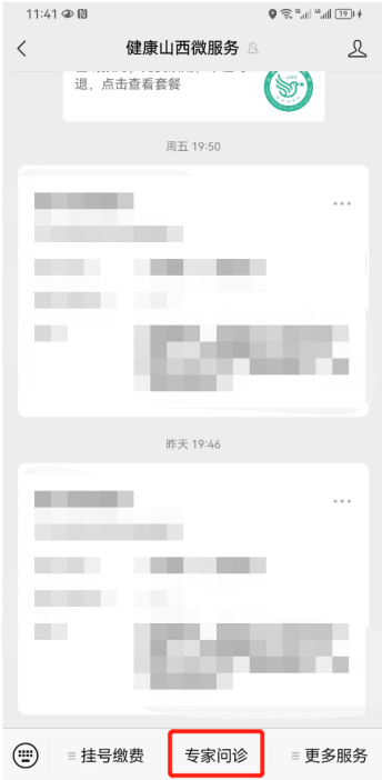 第一步:打开健康山西微服务公众号,通过【专家问诊】菜单,点击【专家问诊】进入。