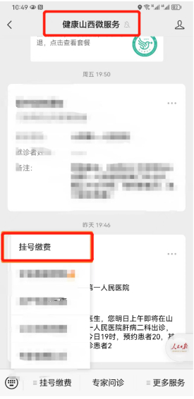 第一步:打开健康山西微服务公众号,通过【挂号缴费】菜单,点击【挂号缴费】进入。
