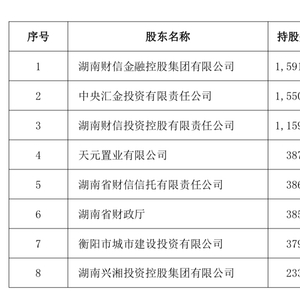 股权转让完成后,湖南省内国有股东合计持股61.32%,其中财信金控集团持股约40.48%,为第一大股东;湖南省财政厅持股4.98%。