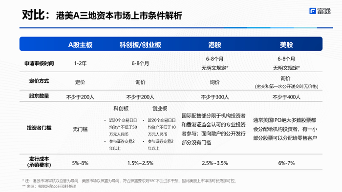 申请审核时间上看,A股主板的申请审核时间通常为1-2年,科创板/创业板、美股和港股的时间通常为6-8个月。