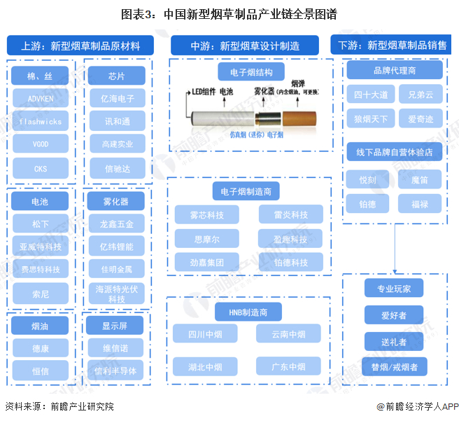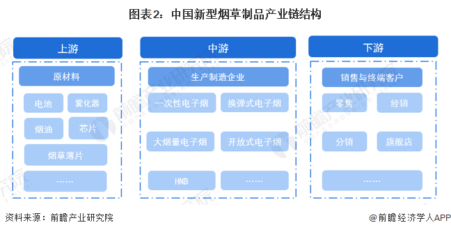 新型烟草制品产业链的上游是原材料供应商,包括了芯片、电子烟壳体等原材料的供应;中游则是电子烟行业的主要参与者——设备制造商和品牌商等,以及加热不燃烧烟草制品的制造商;下游主体则是各代理商、分销商、经销商和终端消费者。