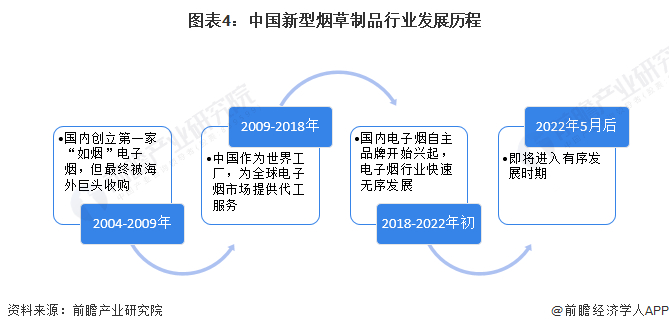 中国的电子烟出现于2004年,由中国药剂师韩力发明,其本来目的是为了帮助父亲戒烟。同年,韩立创立了电子烟品牌“如烟”,并创下了十分优异的市场表现;2009年后,随着电子烟在西方国家的兴起,当时作为“世界工厂”的中国接到了大量电子烟代工厂的订单;2018年起,电子烟国内市场逐渐变得炙手可热,国内市场逐渐不再拘泥于仅仅做海外品牌的代工工作,国内许多厂商开始创立自己的电子烟品牌。其中,被视为行业内龙头的悦刻就是在这一年成立的,经过不断发展,用三年时间在2021年1月完成了上市;随着2022年3月11日《电子烟管理办法》的发布,针对我国电子烟行业的监管政策最终落地,我国电子烟行业即将进入有序发展阶段。