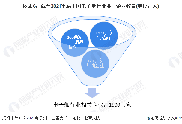 从企业数量来看,2021年末,由中国电子商会电子烟行业委员会主办的"2021第五届国际电子烟产业高峰论坛"在深圳隆重举行。在高峰论坛上,中国电子商会电子烟行业委员会、卷卷智库联合发布了《2021电子烟产业蓝皮书》。根据《蓝皮书》的数据,截至2021年末,我国国内共有电子烟制造及品牌相关企业超过1500家,其中,制造商企业1200余家,电子烟品牌企业200余家以及120家左右的烟油企业。