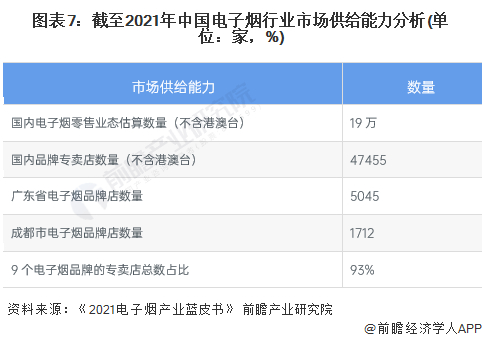 根据《蓝皮书》的数据,截至2021年末,国内的电子烟零售网点数量达到了19万家,其中单独经营一个品牌的专卖店约4.75万家。其中,广东省以5045家品牌店数量排名全国省级第一;成都市以1712家品牌店数量排名全国城市第一。