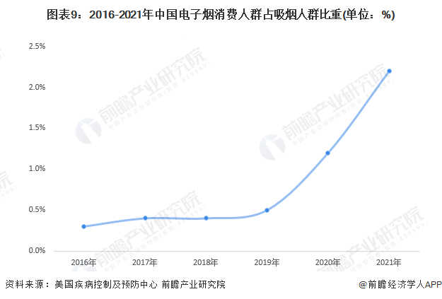 根据美国疾病控制及预防中心的数据,中国烟民中电子烟使用者的渗透率在2020年起快速上升,2021年末初步统计可达到2.2%左右,同比上升83%。