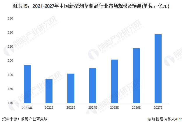 基于此,前瞻预测2027年中国电子烟行业市场规模或将达到219亿元,2022-2027年年复合增速或达到3%。