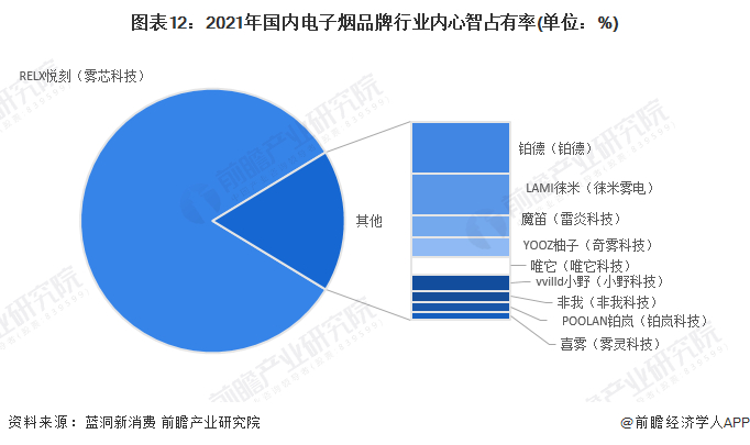 从电子烟行业市场营收份额的角度来看,目前我国电子烟行业呈现雾芯科技(relx品牌)一家独大的局面,雾芯科技市场份额超40%,在国内电子烟行业占据绝对的领先地位。