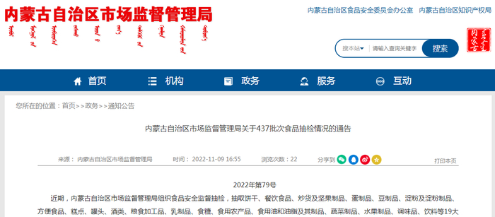 中国质量新闻网讯 近期,内蒙古自治区市场监督管理局组织食品安全监督抽检,共抽检19大类食品437批次样品。其中抽检粮食加工品62批次,合格样品62批次。