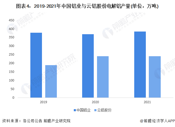 在电解铝产量和销量方面,2019-2021年,中国铝业产量与销量均最高,2021年产量为386万吨,销量为378万吨;云铝股份2021年电解铝产量为241.13万吨,销量为243.72万吨。