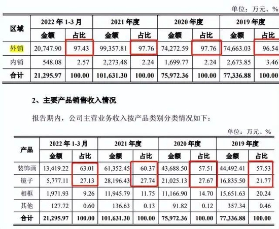 收入结构来看,华鸿股份97%的收入来自外销,主要是欧美市场。主要产品来看,装饰画占据60%的收入,其次是镜子,两大业务占据90%的收入。