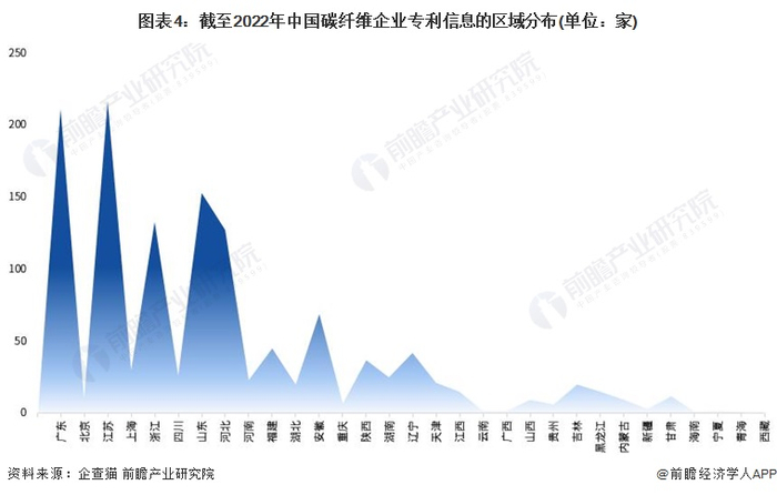 根据中国企业数据库企查猫,目前中国碳纤维行业有相关专利信息的企业主要分布在江苏省、广东省和山东省等地。截至目前,江苏省省共有216家企业拥有专利相关信息,广东省有211家企业拥有专利相关信息,山东省则有153家企业拥有专利相关信息。