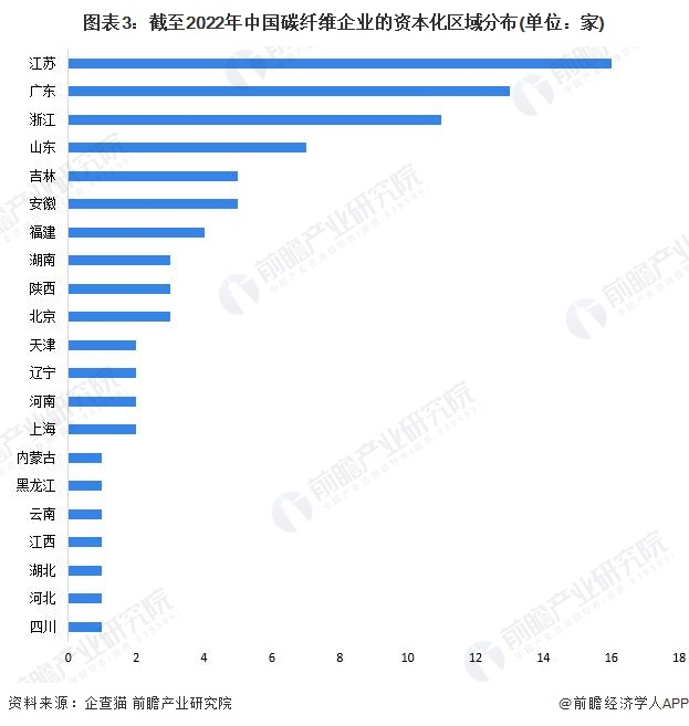 目前,中国碳纤维行业整体资本化程度较低。根据中国企业数据库企查猫,目前中国碳纤维资本化的企业(有融资信息和上市信息)的主要分布在江苏省、广东省和浙江省。截至目前,江苏省共有存续和在业的资本化企业共计16家,广东省有13家,浙江省有11家。