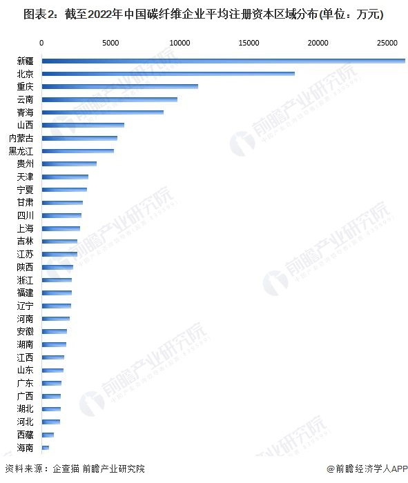 根据中国企业数据库企查猫,目前中国碳纤维企业的平均注册资本区域分布中,新疆相关企业的平均注册资本最高为26305万元,除此外,北京和重庆的碳纤维企业注册资本也在10000万以上,规模相对较大。