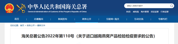 海关总署公告2022年第110号(关于进口越南燕窝产品检验检疫要求的公告)