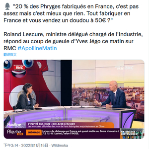 他越说情绪越激动,“让中国人从头到脚装备我们,这意味着什么?还是像弗里吉亚帽这样具有象征意义的东西。法国大革命时期,巴黎街头不讲中文,法国大革命也不是中国人干的。把这件事交给中国人是一个非常负面的信号,表明他们(法国厂商)放弃了尝试的意愿。我们甚至没有向法国公司发出呼吁。如果你不想要更多的工厂,那就直说吧。”