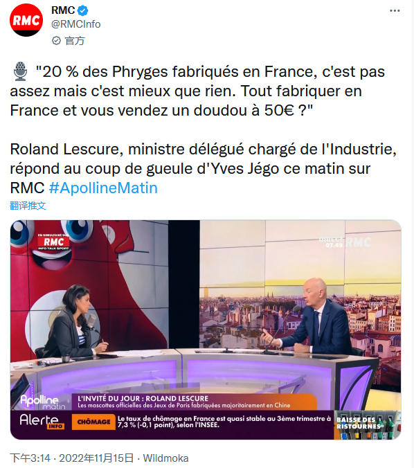 法国经济部负责工业事务的副部长罗兰·莱斯库尔(Roland Lescure)对此神回复道:“还有20%的吉祥物是法国制造的,有总比没有好。”