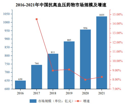 数据显示,2016至2021年中国抗高血压药物市场规模持续增加,虽然增速有所回落,但仍处于8%以上的高速增长中,2021年中国抗高血压药物市场规模约为1035亿元,同比增长8.3%。