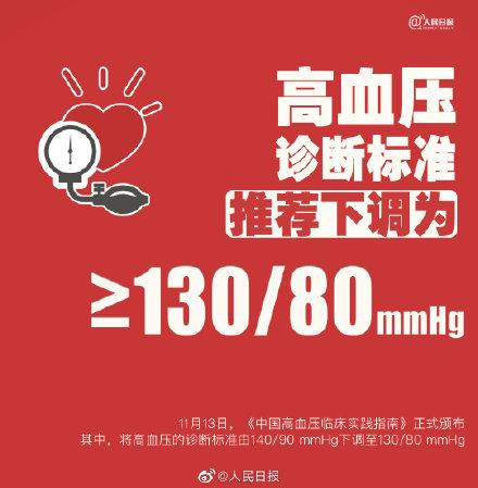 11月13日,首部《中国高血压临床实践指南》发布。其中,推荐将我国成人高血压诊断界值下调为收缩压大于等于130毫米汞柱和/或舒张压大于等于80毫米汞柱。