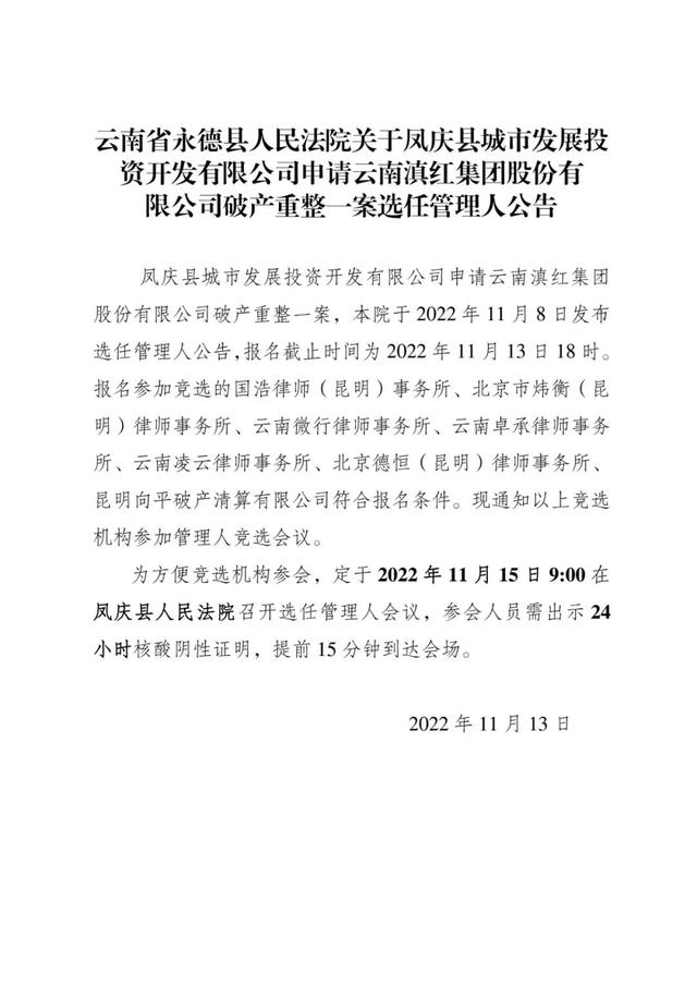 11月13日,云南省临沧市永德县法院官方微信公众号发布《关于凤庆县城市发展投资开发有限公司申请云南滇红集团股份有限公司破产重整一案选任管理人公告》称,“凤庆县城市发展投资开发有限公司申请云南滇红集团股份有限公司破产重整一案,本院于2022年11月8日发布选任管理人公告,报名截止时间为2022年11月13日18时。报名参加竞选的国浩律师(昆明)事务所、北京市炜衡(昆明)律师事务所、云南微行律师事务所、云南卓承律师事务所、云南凌云律师事务所、北京德恒(昆明)律师事务所、昆明向平破产清算有限公司符合报名条件。现通知以上竞选机构参加管理人竞选会议。”