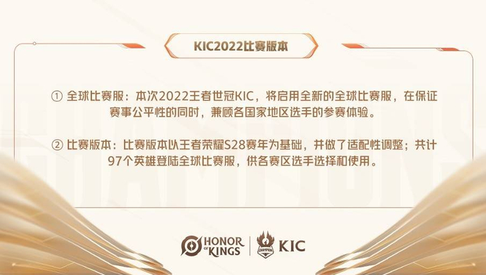 值得注意的是,为了保证赛事公平性,本届世界冠军杯将启用全新的全球比赛服,赛事版本将以王者荣耀S28赛年为基础,并做了部分适配性调整,开放共计97个英雄选择,在保证赛事公平性的同时,兼顾各个国家及地区的选手参赛体验。