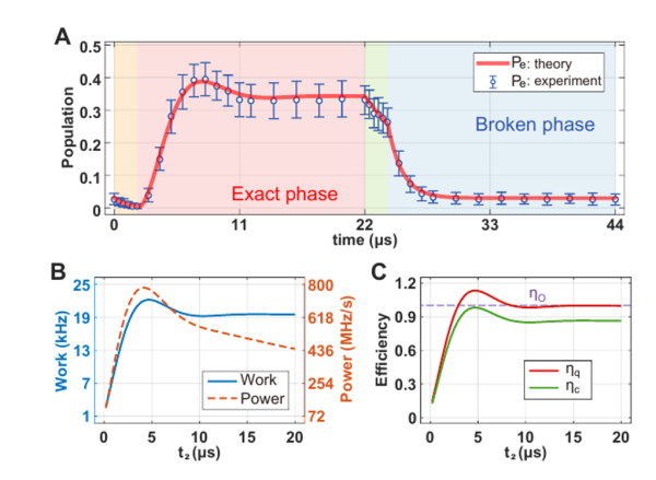 单离子量子奥托热机实验数据:其等容加热冲程处于严格相,等容冷却冲程处于破缺相。(A)测量得到的激发态布居数随时间的变化,橘色、粉红色、绿色、蓝色区域分别代表绝热压缩、等容加热、绝热膨胀和等容冷却等四个冲程。处于严格相的等容加热冲程呈现出明显的布居数振荡。(B)量子奥托热机的功和功率随时间的变化。(C)量子奥托热机的效率随时间的变化,其中红线和绿线分别对应量子热机和传统热机。
