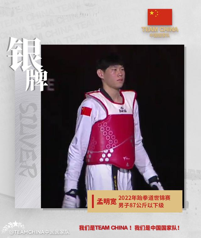 2022年跆拳道世锦赛,孟明宽夺得男子87公斤以下级银牌 媒体滚动 2022.11.16 10:42 转自:九派新闻11月16日,据TEAMCHINA中国国家队官方微博:2022年跆拳道世锦赛,中国选手孟明宽在男子87公斤以下级夺得银牌!
