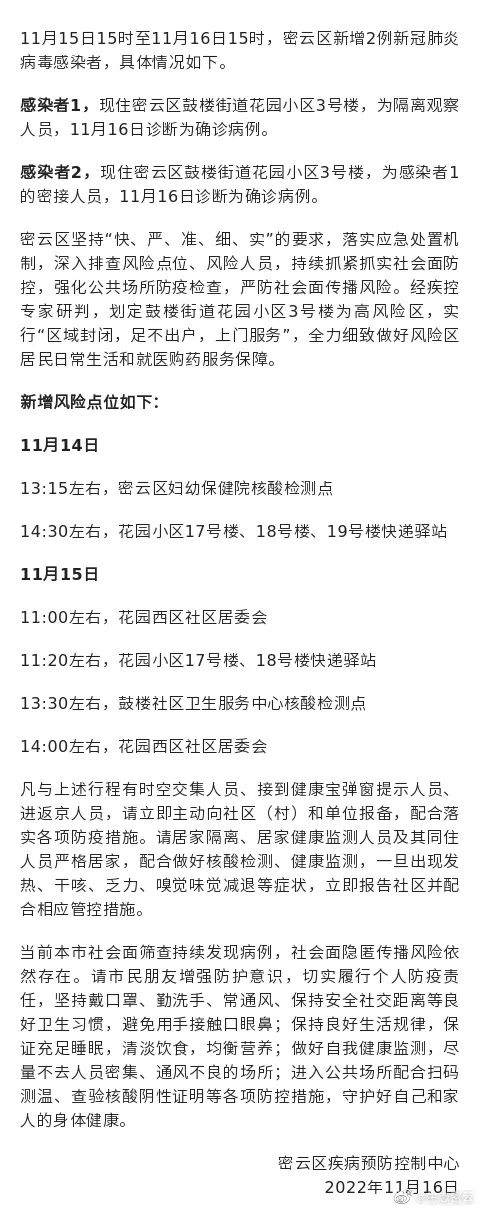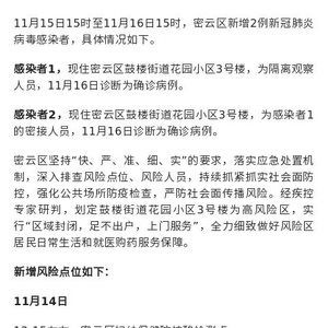 据生态密云官博消息,北京市密云区新增2例新冠肺炎病毒感染者,新增风险点位公布。