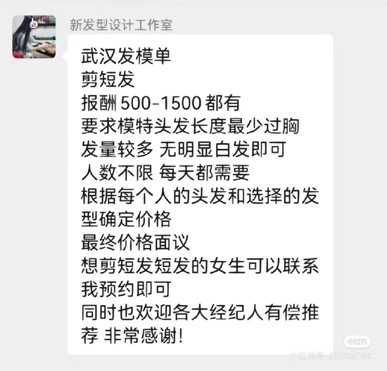 11月12日,武汉女孩小溪在群聊中看到了“新发型设计工作室”剪发模特的招聘消息,有500元报酬。“我以前做过发模,当时正好想剪短发,看到这则通告,感觉价格还合适,就报名了。”她说,当时以为这只是一次普通的剪发经历。