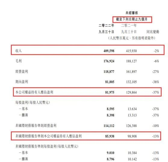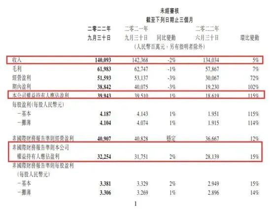 2022年前三季度,公司实现营收4095.98亿元,同比下降2%,前三季度公司权益持有人应占盈利819.75亿元,同比下降37%;非国际财务报告准则下,前三季度公司权益持有人应占盈利859.38亿元,同比下降13%。