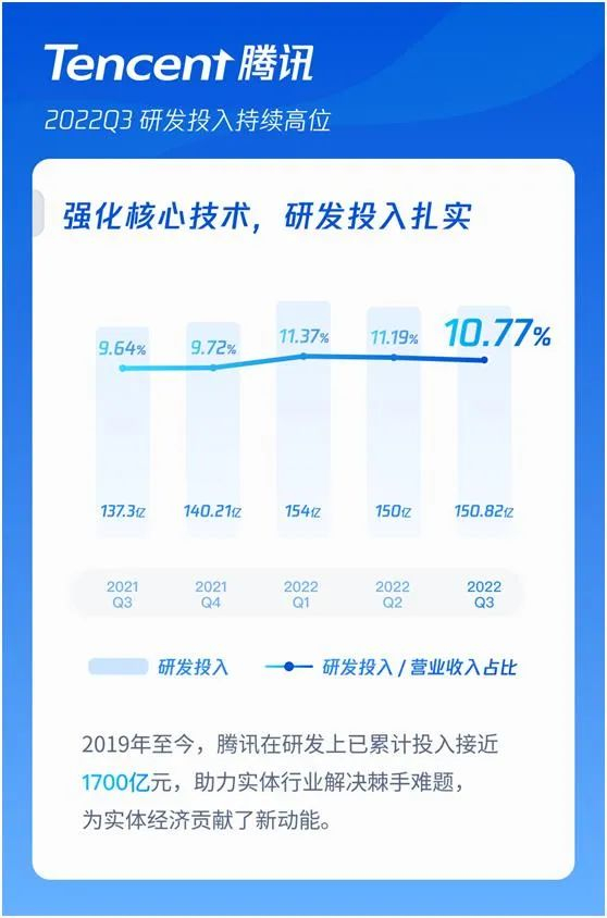 腾讯研发投入持续高位。第三季度研发投入达到150.8亿元,同比增长9.8%,2022年前三季度研发投入已经超过450亿元。2019年以来腾讯累计研发投入已经接近1700亿元,增长曲线远超同期营收和净利的增长水平。