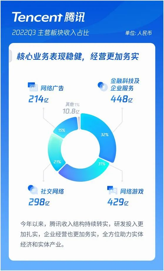 三季报显示,代表数实经济的金融科技与企业服务板块率先实现逆风增长,第三季度实现营业收入448亿元,同比增长4%,收入占比提升到32%,扛起腾讯业务稳增长大旗。