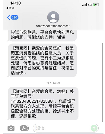 淘宝客服回复已报警的消费者称,会积极配合警方处理。受访者提供