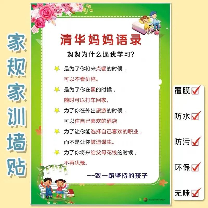 身为90后的果果(化名)最近和丈夫有了备孕计划。对于这类励志语录,她的丈夫认为,这就是把学习功利化,虽然功利一点也没太大关系,但把努力学习简单等同于以后可以赚好多钱,这一点在现实生活中不能完全成立,如果孩子真信了,以后可能会崩溃。