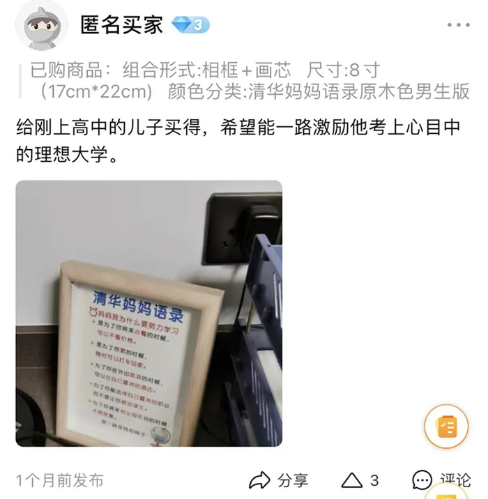 近日,电商平台销售的“清华妈妈语录”引发关注。该商品有木质相框摆件、也有墙纸形式,内容均为激励孩子努力学习的话语。这类商品在部分网店销量不菲,有买家评价称,“买给孩子的生日礼物,太惊喜了”、“送给读高中的儿子,很有激励作用”等。