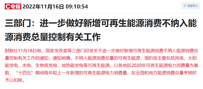 据今日早上消息,国家发改委等三部门印发关于进一步做好新增可再生能源消费不纳入能源消费总量控制有关工作的通知。通知明确,不纳入能源消费总量的可再生能源,现阶段主要包括风电、太阳能发电、水电、生物质发电、地热能发电等可再生能源。以各地区2020年可再生能源电力消费量为基数,“十四五”期间每年较上一年新增的可再生能源电力消费量,在全国和地方能源消费总量考核时予以扣除。