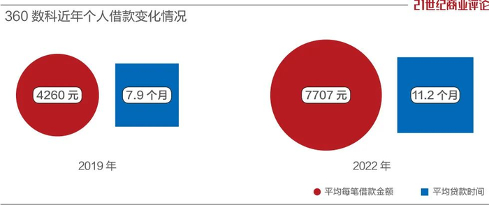《21CBR》记者查询发现,360数科的借款统计中,个人借款平均每笔金额,从2019年的4260元涨至如今的7707元,平均贷款时间从7.9个月延长到11.2个月。