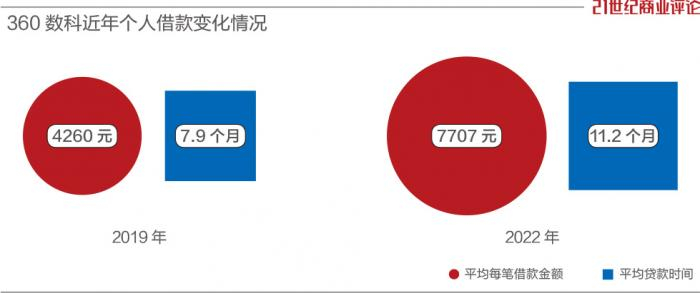 《21CBR》记者查询发现,360数科的借款统计中,个人借款平均每笔金额,从2019年的4260元涨至如今的7707元,平均贷款时间从7.9个月延长到11.2个月。