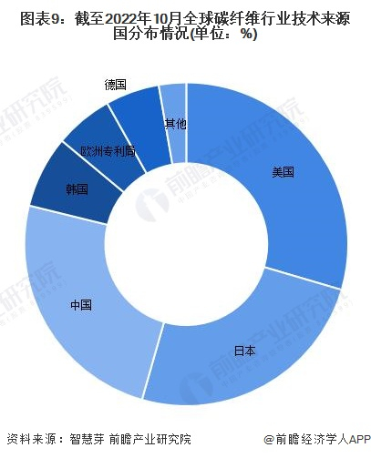 目前,全球碳纤维第一大技术来源国为美国,美国碳纤维专利申请量占全球碳纤维专利总申请量的27.04%;其次是日本,日本碳纤维专利申请量占全球碳纤维专利总申请量的322.75%;中国专利申请量排名第三,占比为22.35%。